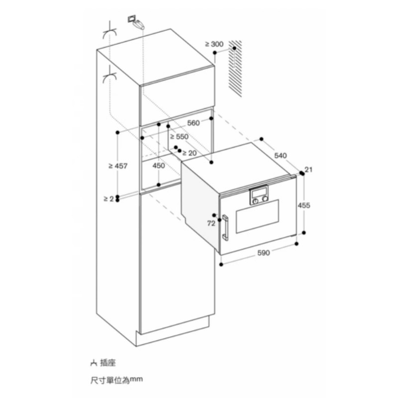 - 家電前側較櫥櫃突出 21mm,門把外緣突出 72mm