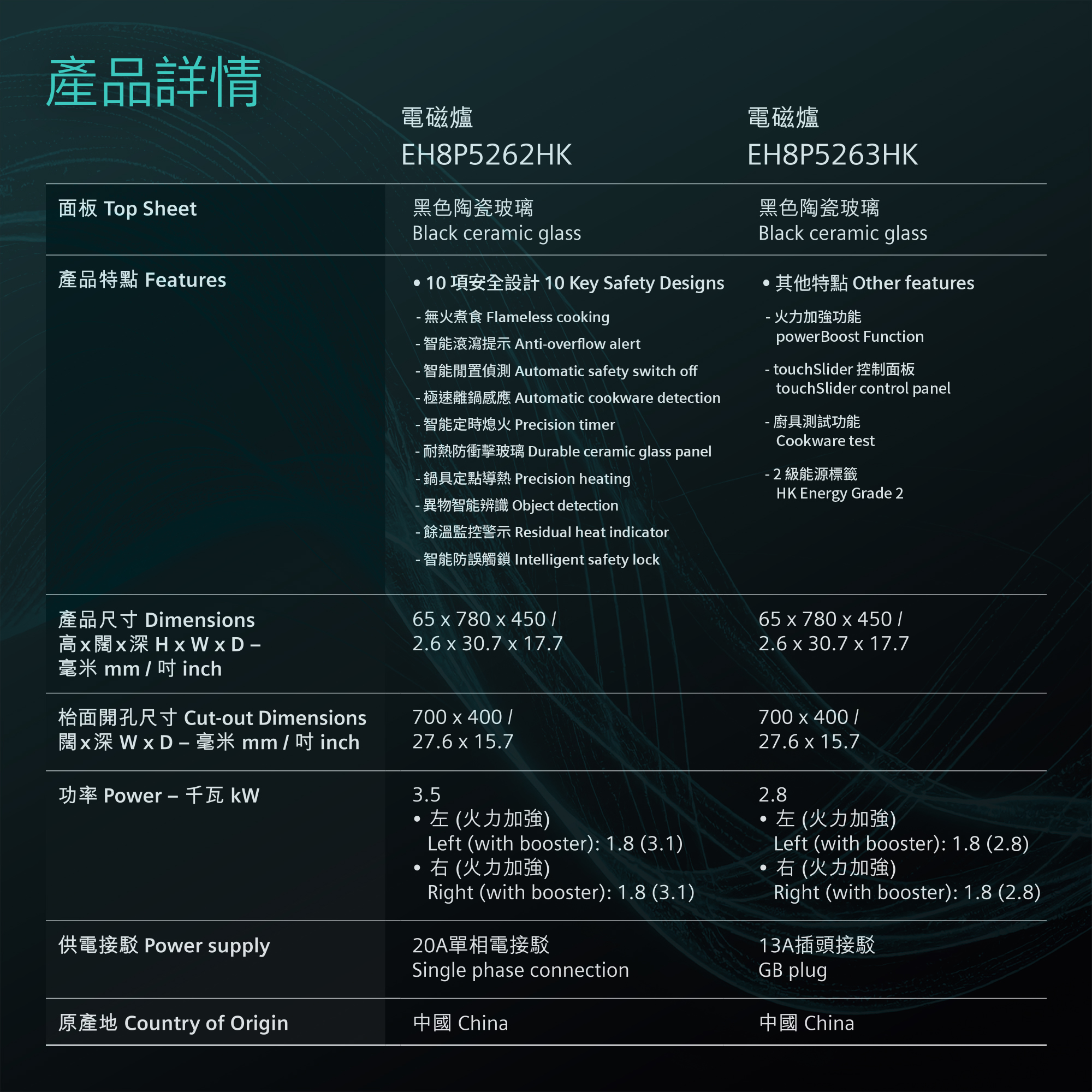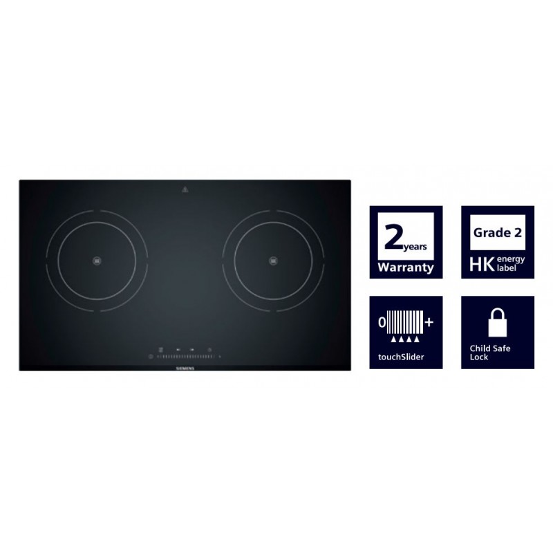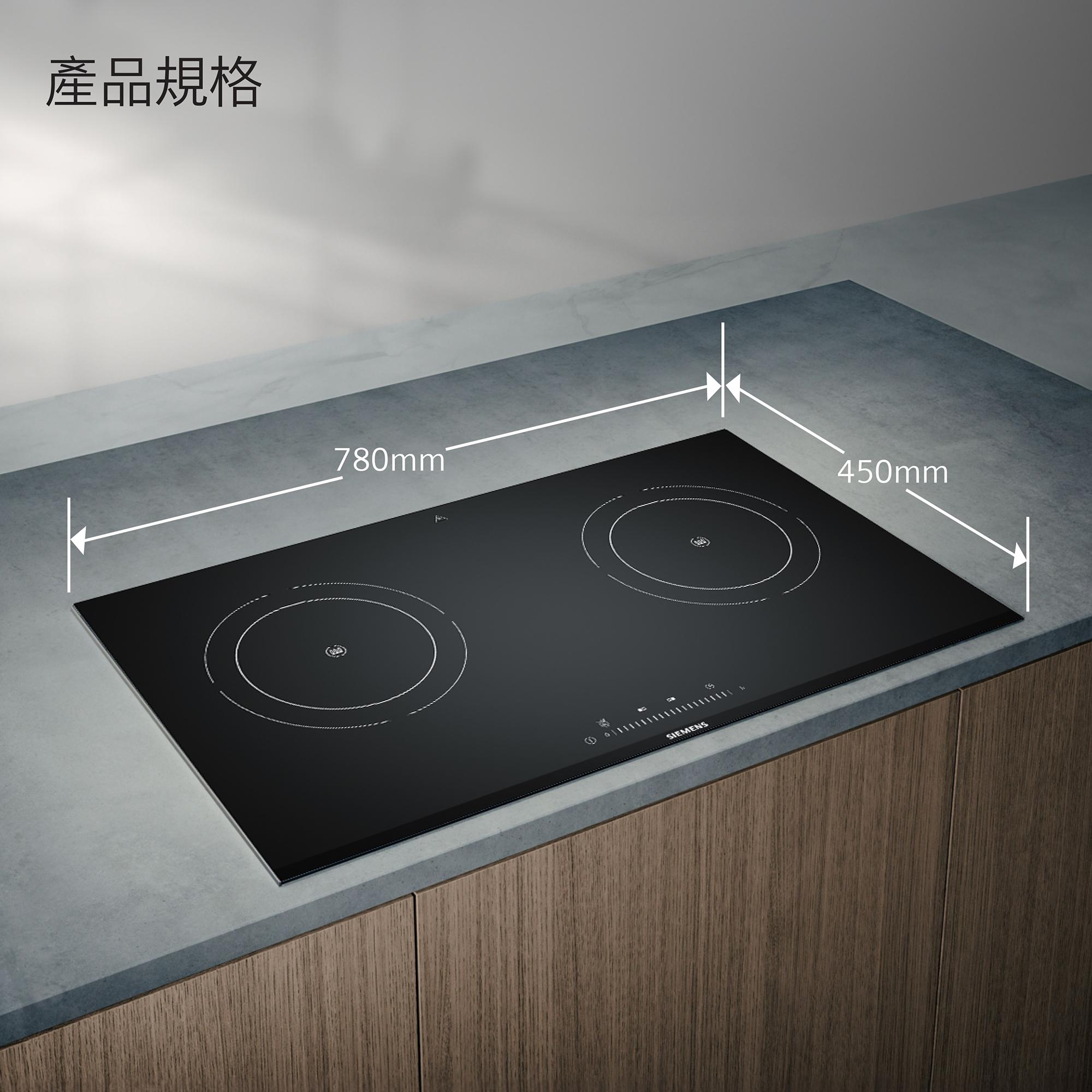 Siemens 西門子 EH8P5262HK 78厘米 iQ500 嵌入式雙頭電磁爐採用黑色陶瓷玻璃面板設計,結合獨家 touchSlider 控制面板與 17 段火力調控,總火力達 3.5kW,為現代廚房提供精確且高效的烹飪體驗。