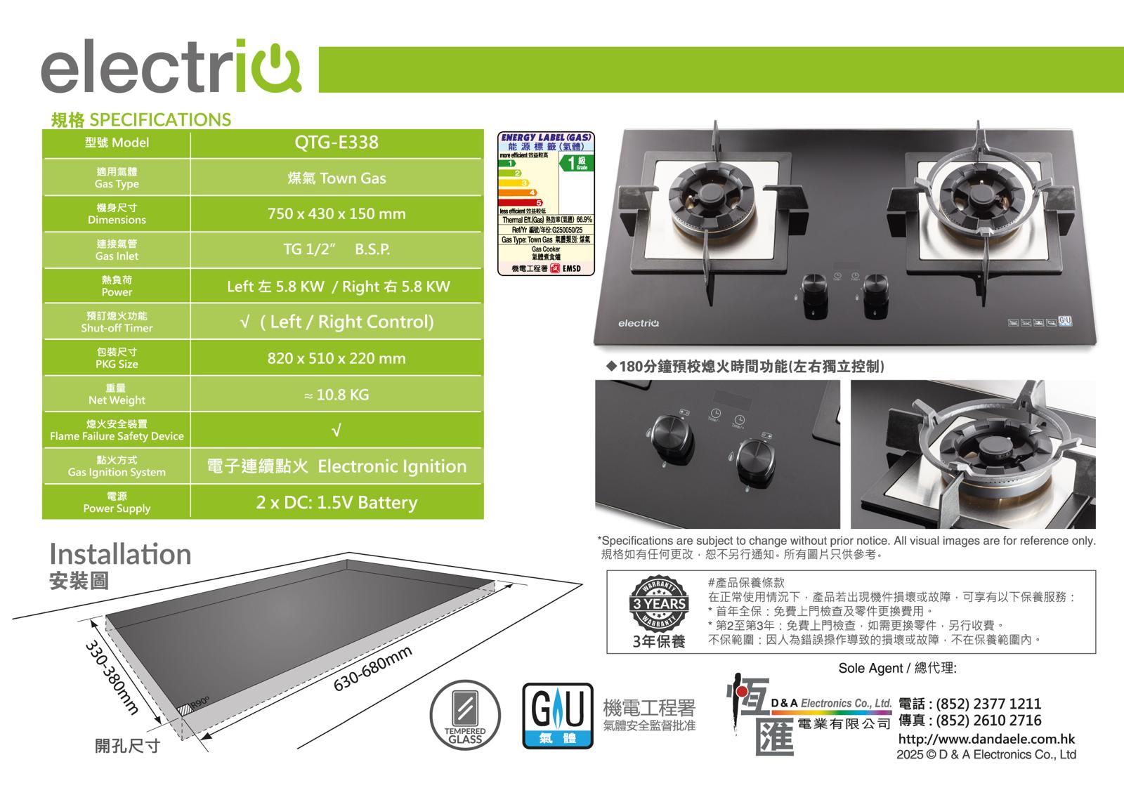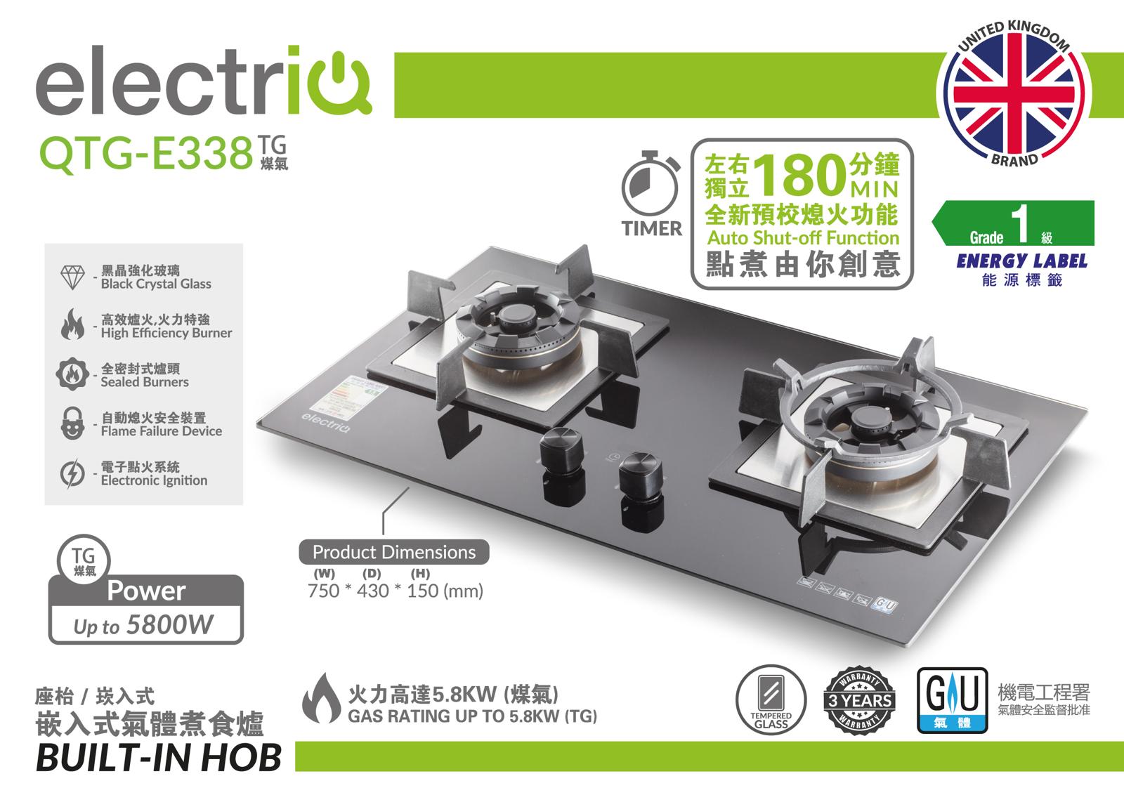 ELECTRIQ QTG-E338TG 嵌入式雙頭煤氣爐融合多重先進安全設計,包括特級防爆鋼化玻璃、實用的防漏氣保護裝置及智能自動熄火功能,全方位為您的家庭烹飪提供最高層級的保護。為確保您的使用安心無憂。