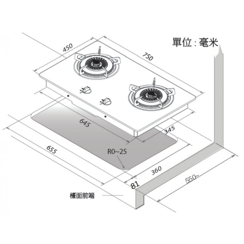 • 開孔尺寸 (闊 x 深): 655-695 x 360-410 毫米 (彈性範圍,參考開孔尺寸 695 x 410 毫米)