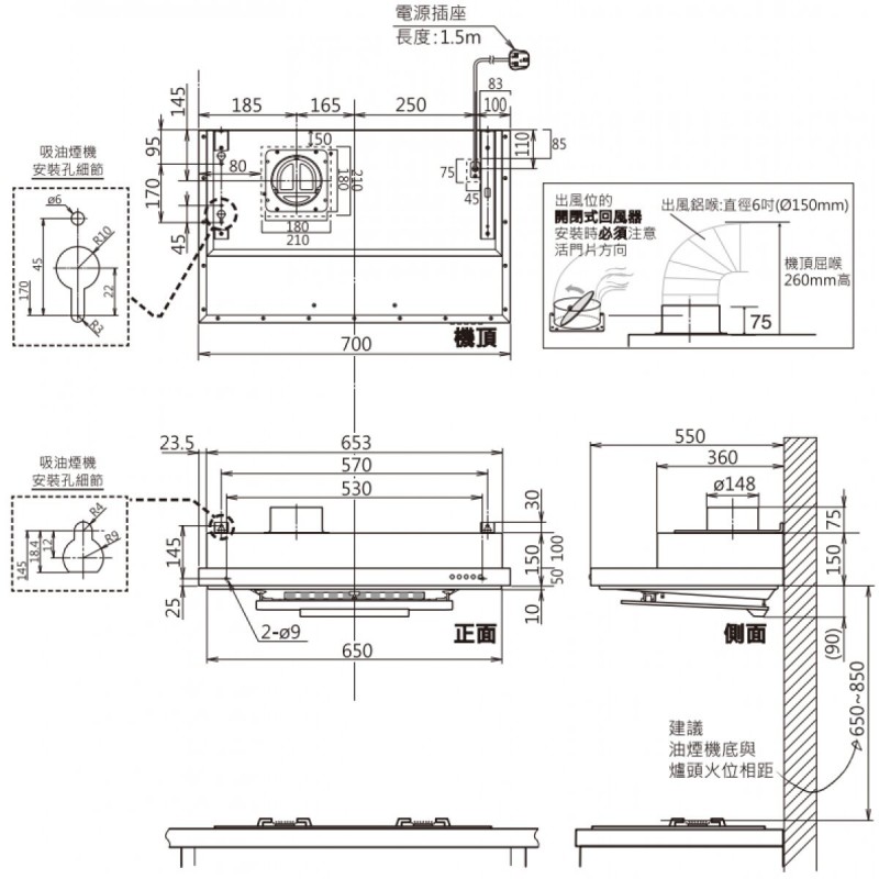 | 抽油煙機標準安裝規格 a. 包鋁喉8呎(5或6吋) b. 開玻璃孔一個(安全情況下) 不包開木孔 不包修改煙囪 不包拆間格板 抽油煙機安裝工程注意事項: 需預留足夠空間開玻璃孔,否則不會提供此服務,如廚櫃貼近玻璃開孔位置,建議裝廚櫃前先自行安排開玻璃孔 請確保安裝位置必須有足夠安全距離,否則不能提供安裝服務 一般抽油煙機底與電爐面/氣體爐架相距最少約700mm/28吋 (或跟代理安裝指引) |