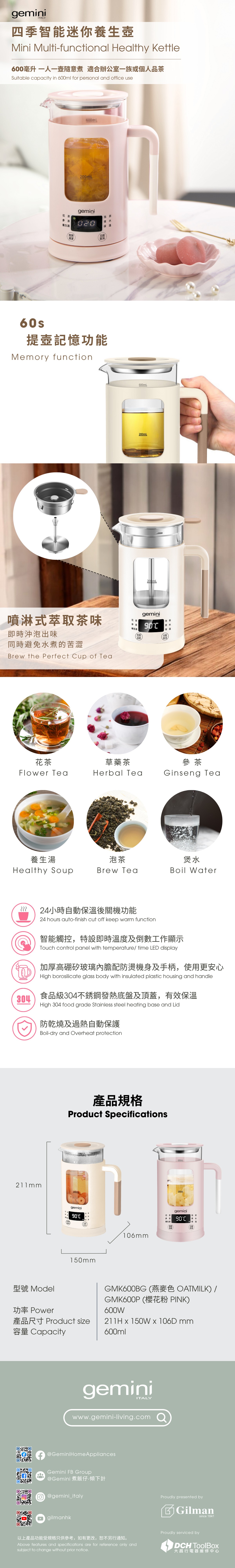 GEMINI GMK600BG 四季智能迷你養生壺具備 600 毫升容量與 600 瓦功率,專為辦公室一族或個人品茶愛好者設計,實現一人一壺隨意煮的便利體驗。