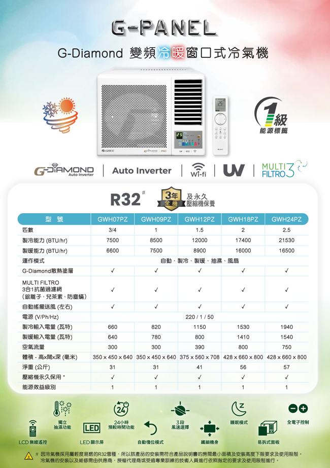 Gree 格力 GWH07PZ 3/4匹 R32 G-Panel 雙黑鑽 變頻冷暖 窗口式冷氣機評價