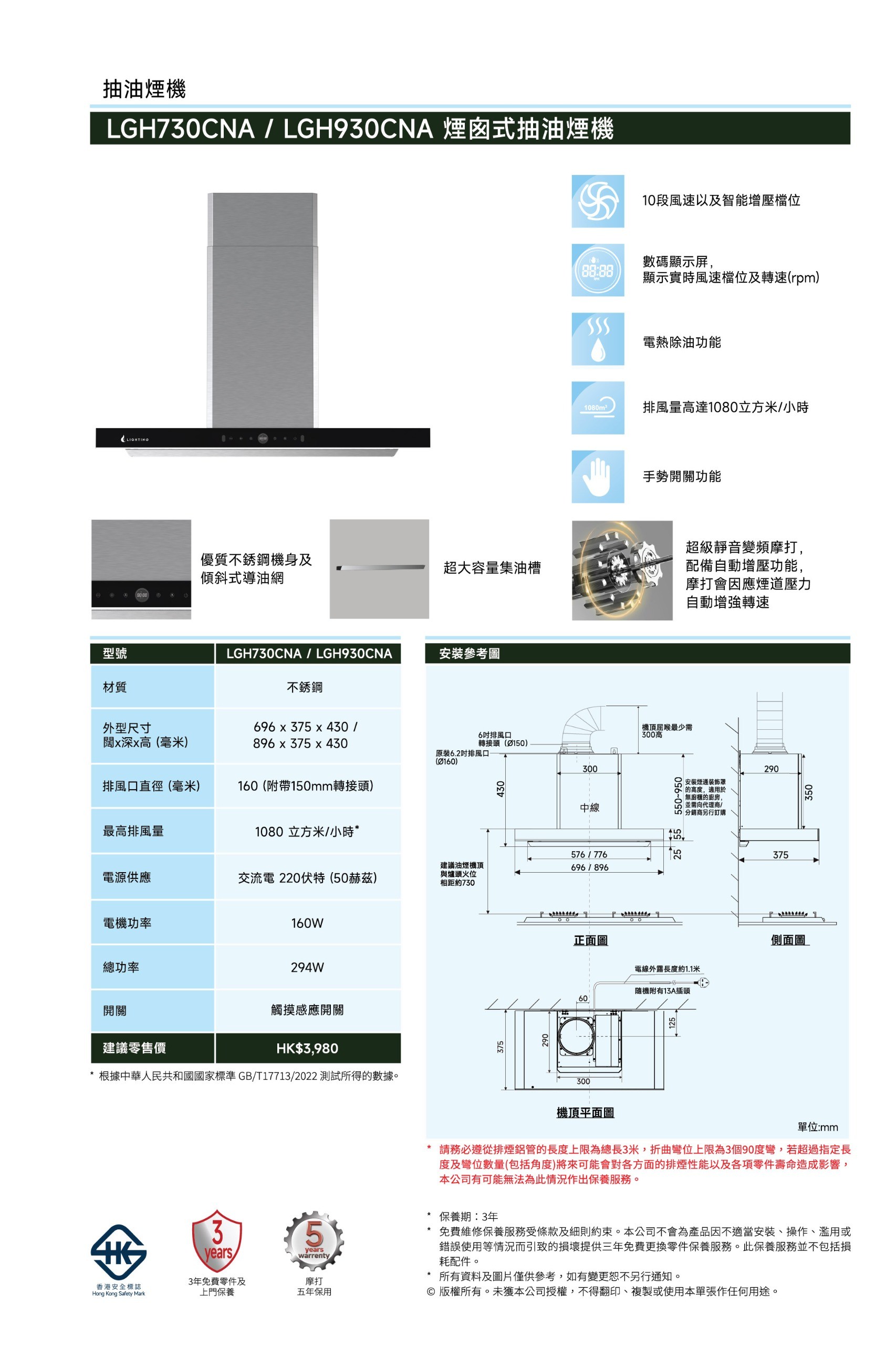 - 智能變頻動力: 配備超級靜音變頻摩打,支援自動風壓增壓,當感應到煙道阻力時會自動維持穏定轉速。