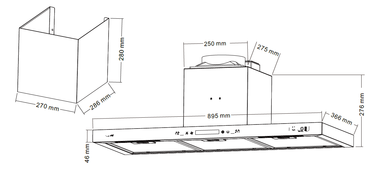 一般抽油煙機底與電爐面/氣體爐架相距最少約700mm/28吋 (或跟代理安裝指引)