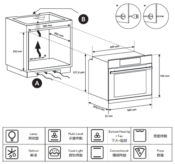 - 開孔尺寸 (高x闊x深):585 x 560 x 560 毫米
