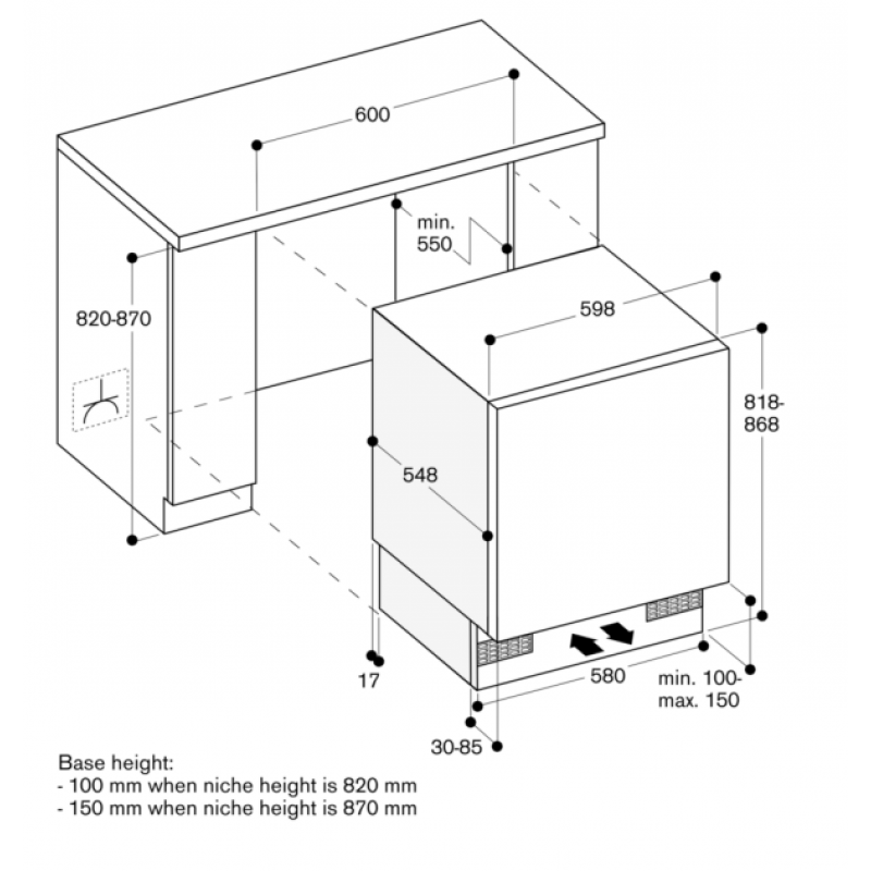• 底座高度要求:嵌入高度 820 mm 時需 100 - 170 mm;嵌入高度 870 mm 時需 150 - 220 mm
