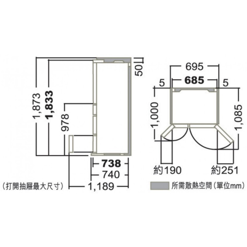 - 產品主機體尺寸 (闊 x 高 x 深): 685 x 1,833 x 738 毫米
