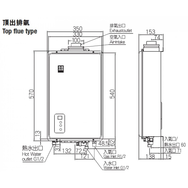 - 排氣方式: 頂出排氣式 (T-flue)