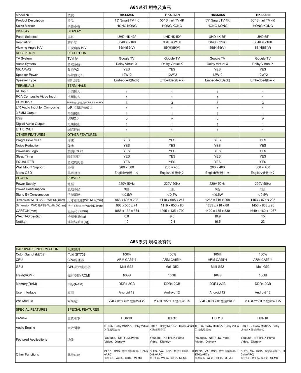 HISENSE 海信 50A6N 是一款 50 吋 4K UHD Google TV,結合 3840x2160 超高清解像度與 Dolby Vision HDR 技術,並搭載 Google TV 智能系統,為您提供豐富的串流娛樂與細緻的影像體驗。