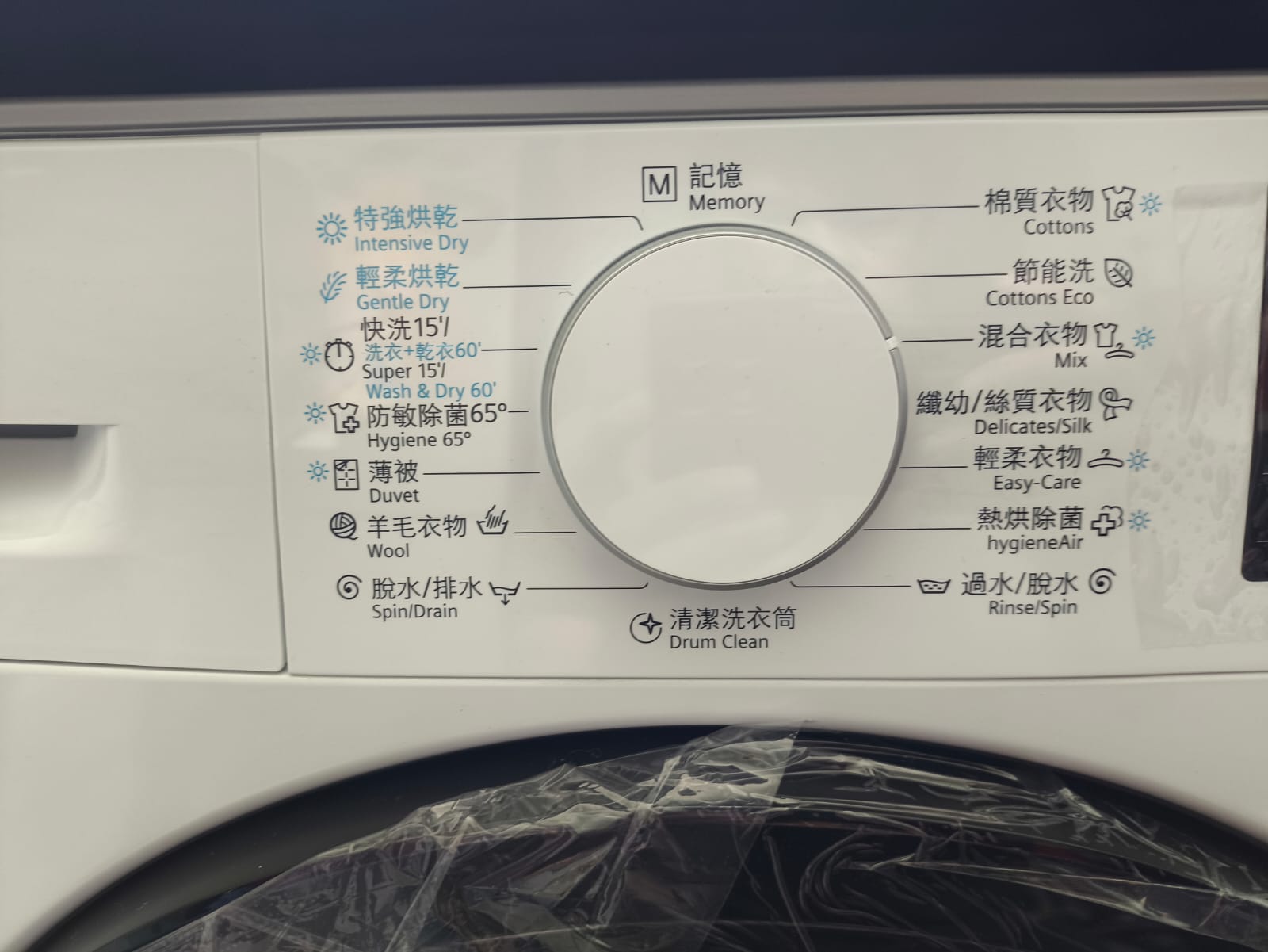 - 多種洗衣程序: 內置棉質、混合衣物、纖幼/絲質、羊毛衣物、防敏除菌65℃等多種程序,全面照顧不同衣物類型。