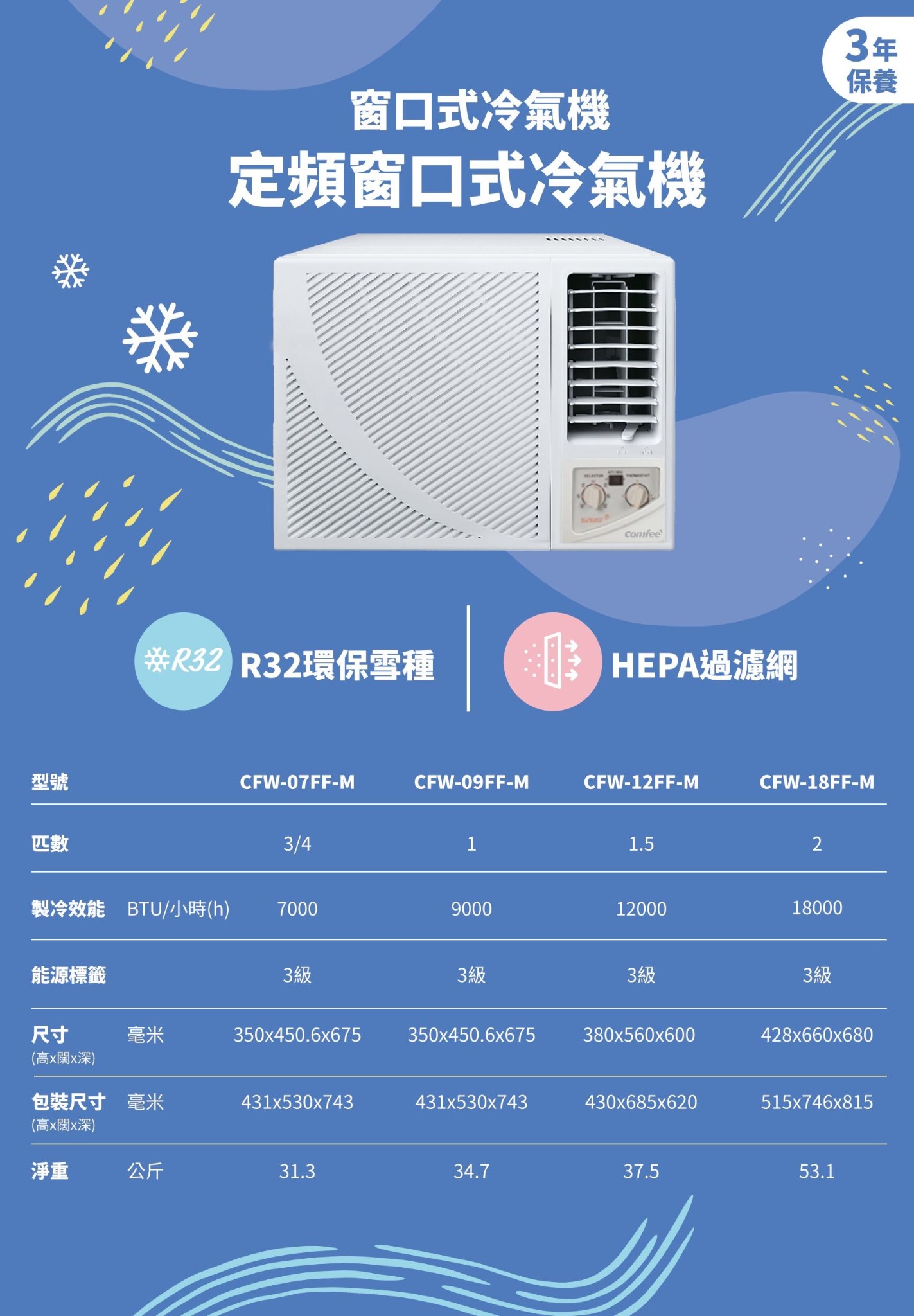 The COMFEE' CFW-12FFM 1.5HP R32 Cooling Window Type Air Conditioner offers a powerful 12,000 BTU/h cooling capacity, designed for efficient home cooling. This model utilizes the eco-friendly R32 refrigerant, significantly reducing its global warming impact, and holds a Level 3 Energy Label, ensuring energy efficiency alongside comfortable cooling. Its robust and durable construction provides a reliable solution for combating hot weather.