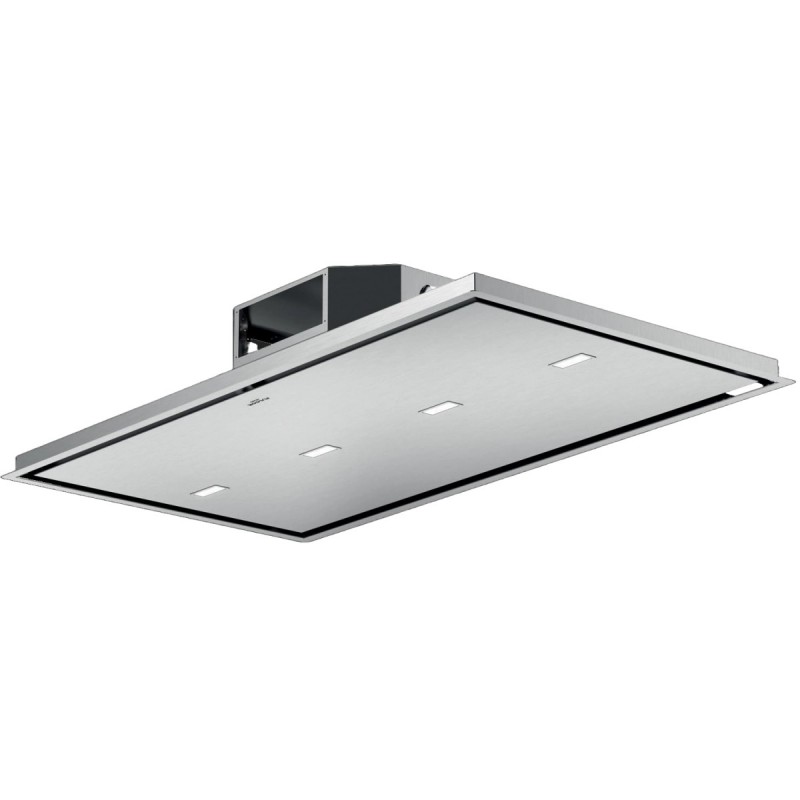 The Fulgor FCHD 1200 RC X is a 120cm wide ceiling-mounted hood featuring a stainless steel finish, perimeter extraction, and remote control operation, delivering a high extraction performance of up to 600 m³/h.