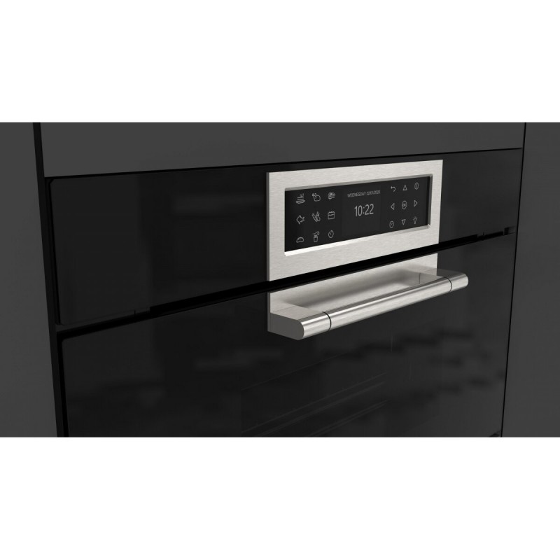 The Fulgor FCLSO 7510 TEM BK is a 45cm built-in combi steam oven from the sophisticated CLUSTER series. This 34-litre oven blends deep black glass with stainless steel finishes and features the advanced CREACTIVE EXTENDED operating system, delivering exceptional cooking performance and modern aesthetics to your kitchen.
