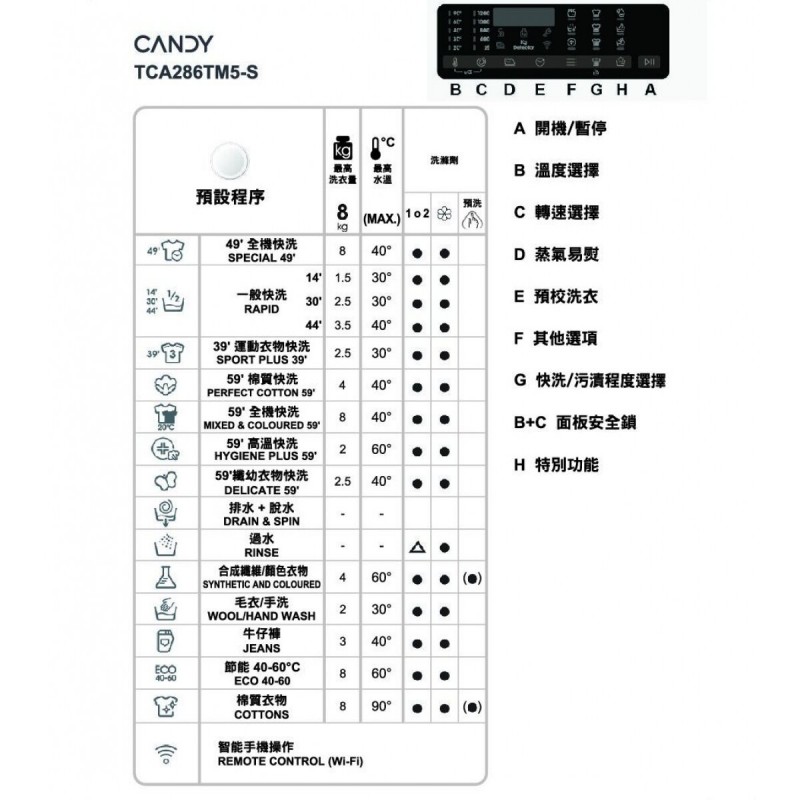 The CANDY TCA286TM5-S is an 8kg 1200rpm Top Loaded Washer engineered for efficient and effective laundry care. This appliance features a powerful BPM Inverter Motor, providing quiet operation and enhanced durability. With its 8kg capacity and a maximum spin speed of 1200rpm, it ensures thorough cleaning and faster drying times. Awarded HKEEL Grade 3 for energy efficiency, the TCA286TM5-S offers significant energy savings, making it an ideal choice for modern households seeking high performance and smart connectivity.