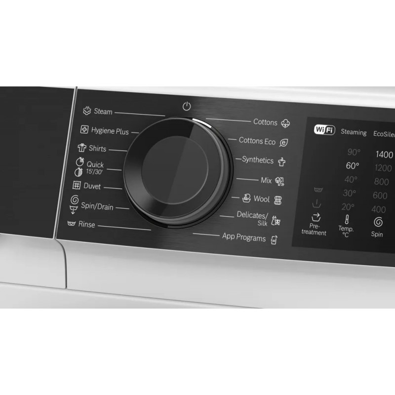 - Programs: Steam Care, Cotton, Cotton Eco, Synthetics, Mixed Load, Delicates/Silk, Wool, Anti-Allergy, Shirts, Super Quick 15'/30', Duvet, Spin/Drain, Rinse.