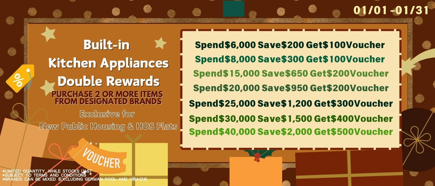 During the event period, new Public Housing / Subsidized Sale Flat customers, purchase 2 or more built-in kitchen appliances (excluding German Pool and Hibachi) to enjoy the following promotion: