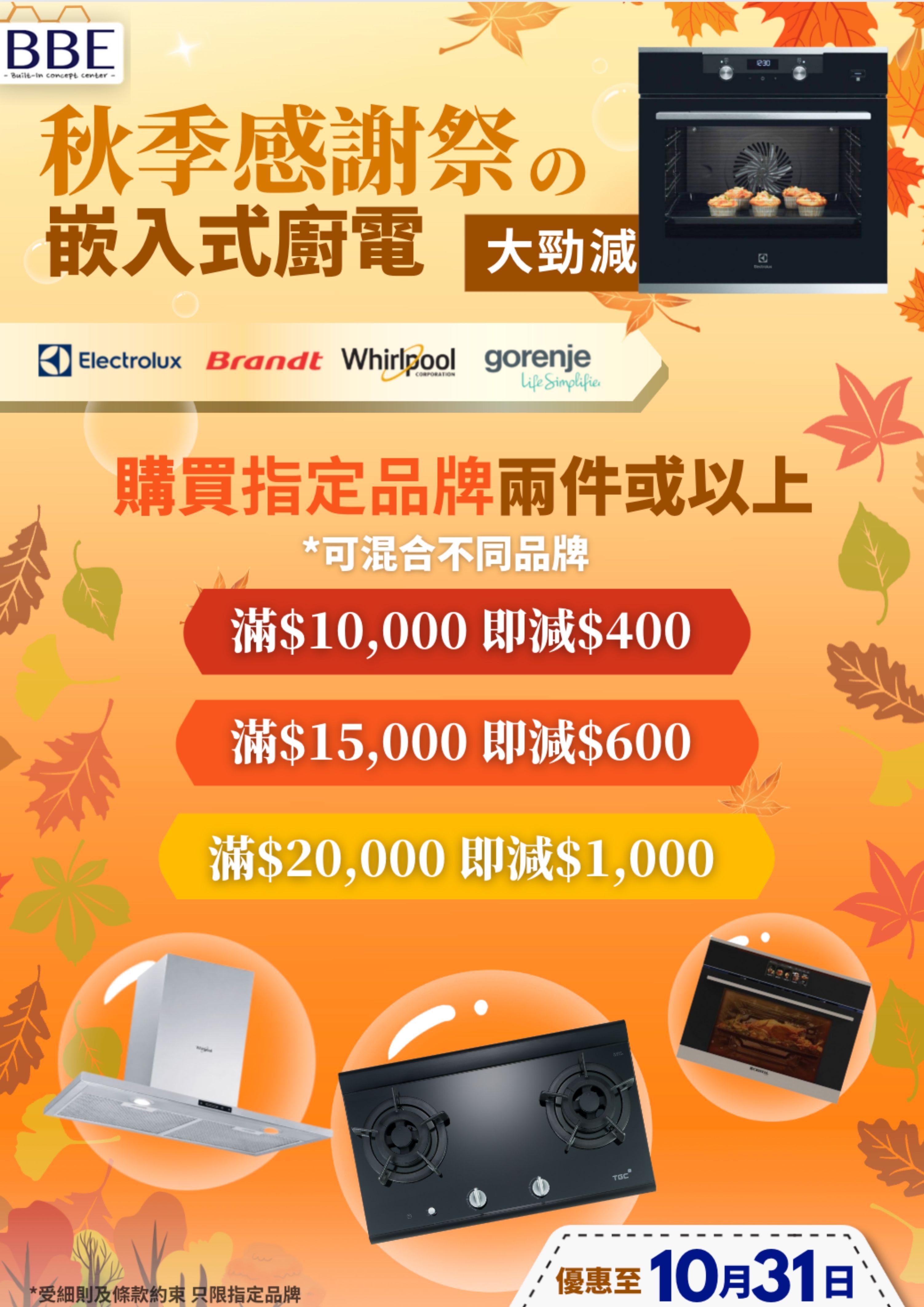 秋日感謝祭 嵌入式廚電大勁減 即日起至10月31日購買兩件或以上指定嵌入式廚房電器品牌 蒸焗爐/抽油煙機/煮食爐
