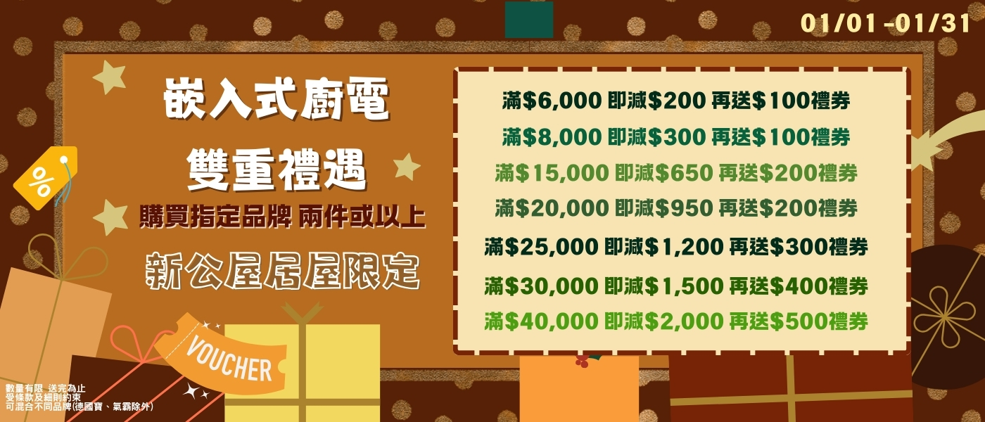 新公屋/居屋 客戶,凡於活動期間購買2件或以上嵌入式廚房電器(德國寶GERMAN POOL,氣霸HIBACHI除外),即可享受以下優惠:
