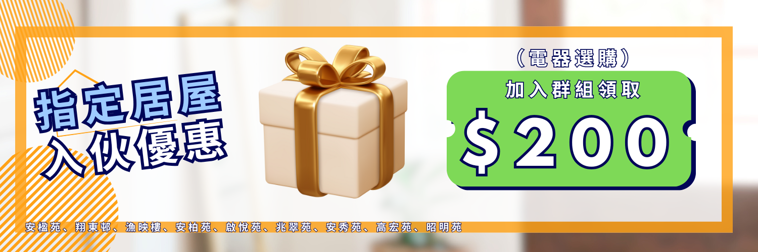 指定屋苑:安楹苑、翔東邨、漁映樓、安柏苑、啟悅苑、兆翠苑、安秀苑、高宏苑、昭明苑。入group 可享$100 x 2 現金券,買滿$2000可用一張。每個單位計(不可與現有新居入伙優惠共同使用)