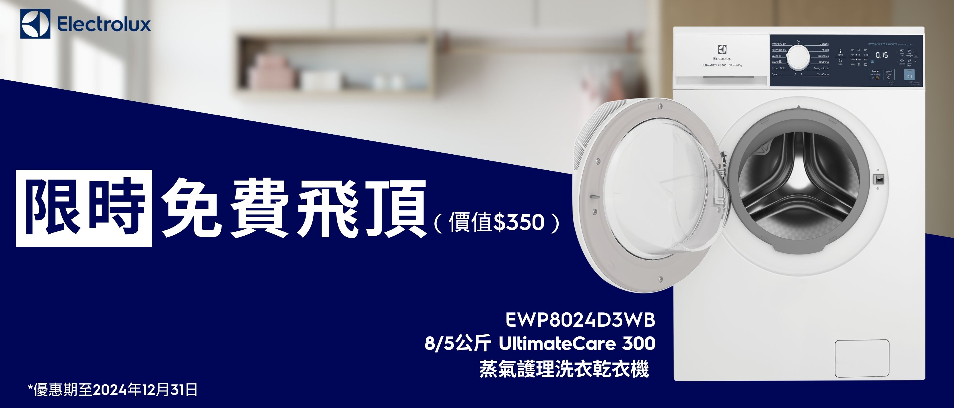 凡於推廣期內購買伊萊克斯8/5公斤UltimateCare 300蒸氣護理洗衣乾衣機(EWP8024D3WB),即享免飛頂費優惠(價值HK$350)。