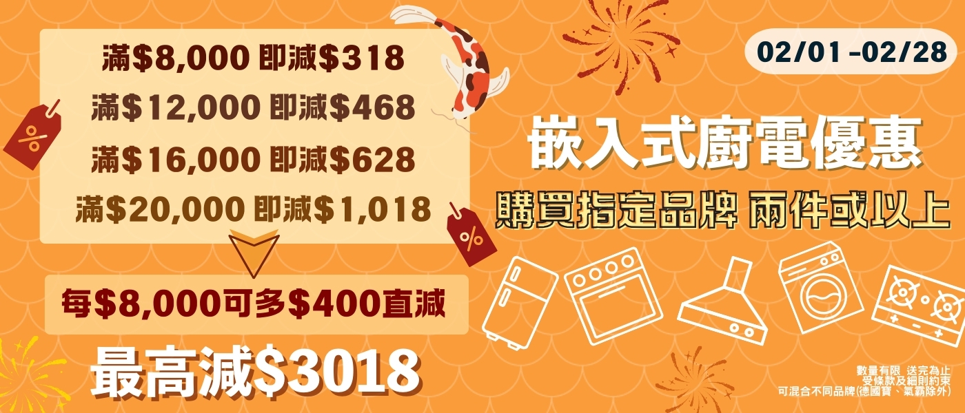 馬年將至!想趕喺新年前入伙兼換新家電?BBE 2 月限定優惠幫到你!精選名牌蒸焗爐、煮食爐、洗碗碟機激減發售。清貨區長期有筍貨,嵌入式廚電及電子門鎖優惠同步放送,再豪送超市禮券!即刻入手,用全新家電招呼親朋戚友,型住過新年!
