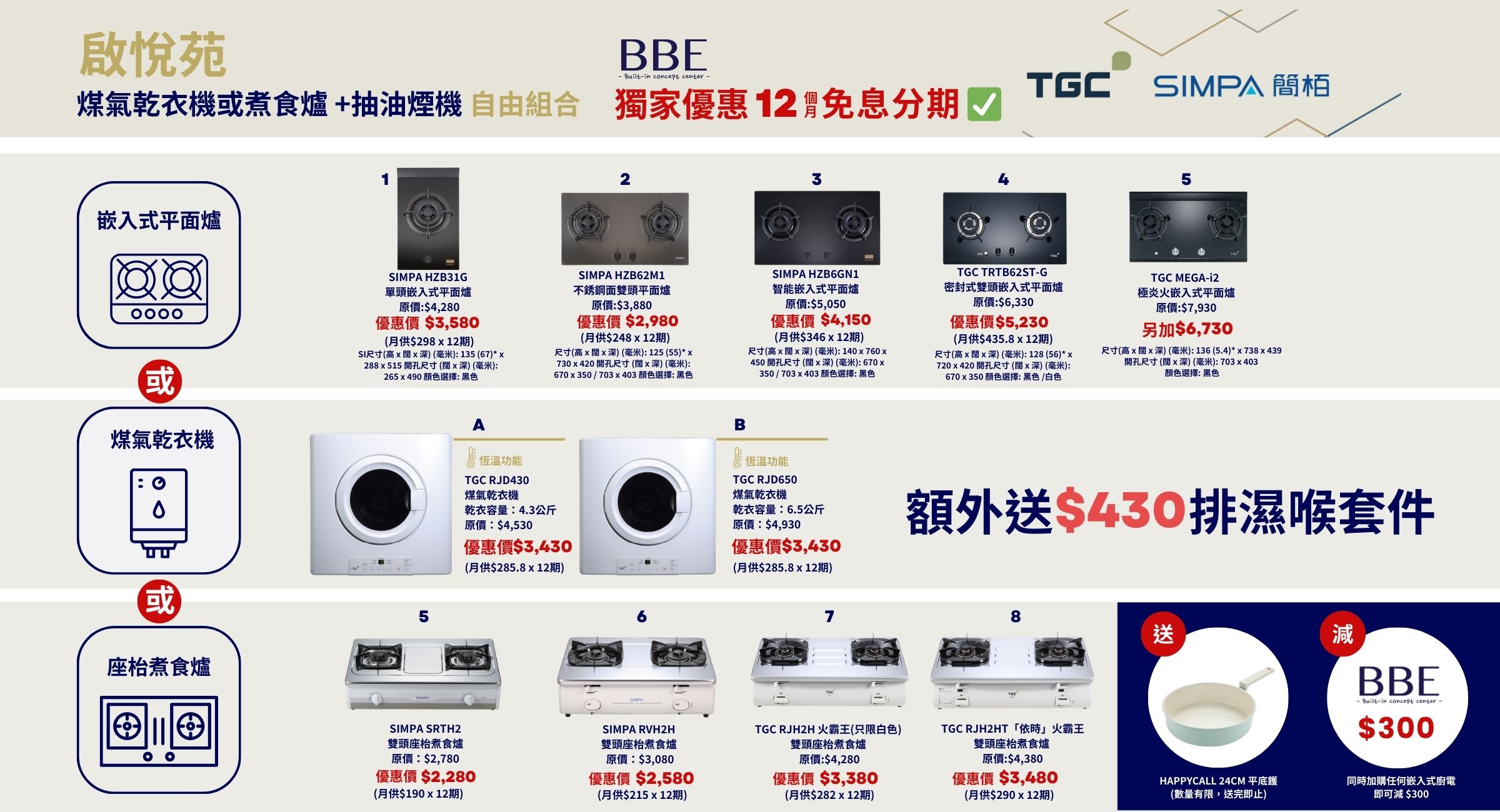 獨家電器爐具優惠!啟悅苑獨家優惠,12個月免息分期,月供低至$499!