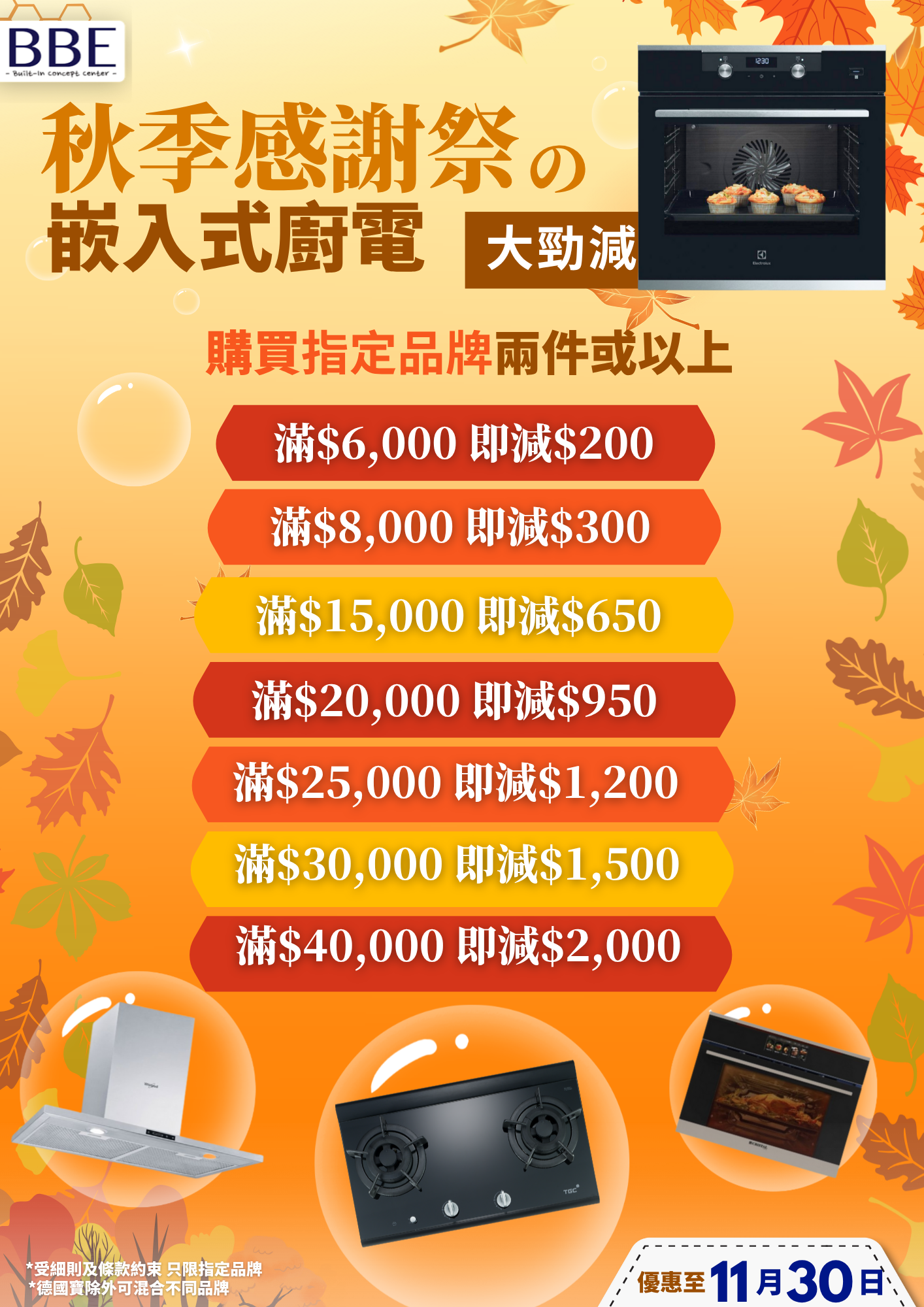 凡於活動期間購買2件或以上嵌入式廚房電器(德國寶GERMAN POOL除外),即享以下折扣: