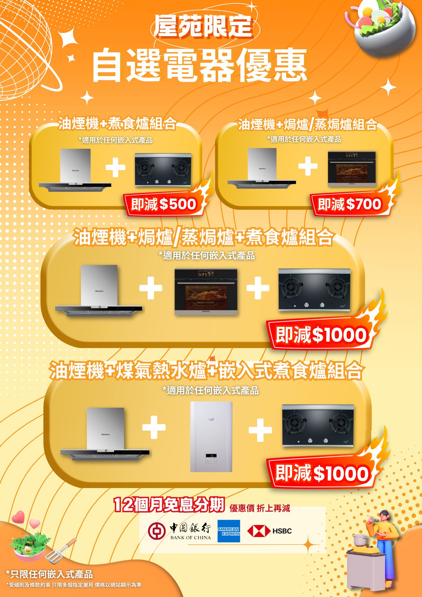 | 油煙機 + 焗爐/蒸焗爐 + 煮食爐組合 | 即減 $1000 |
