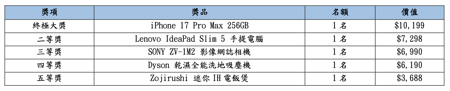 抽獎活動登記日期:2026 年 3 月 5 日至 5 月 12 日